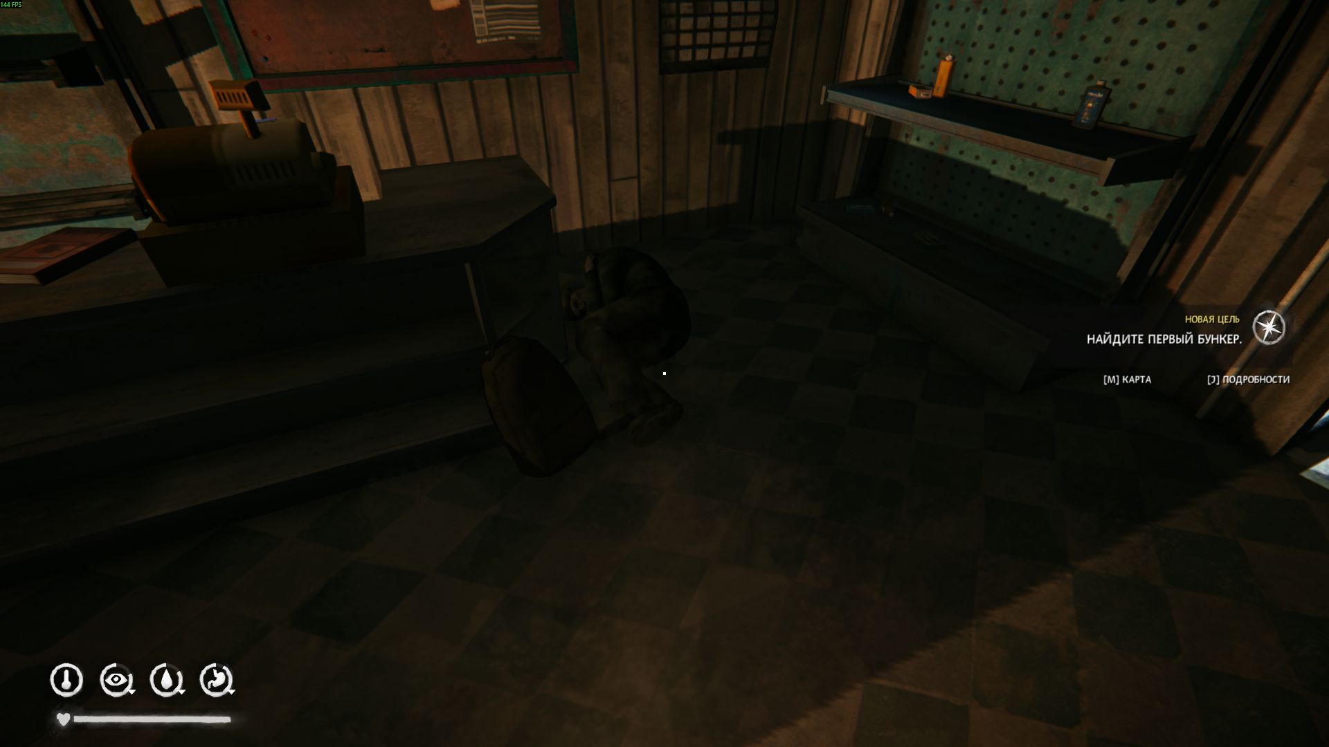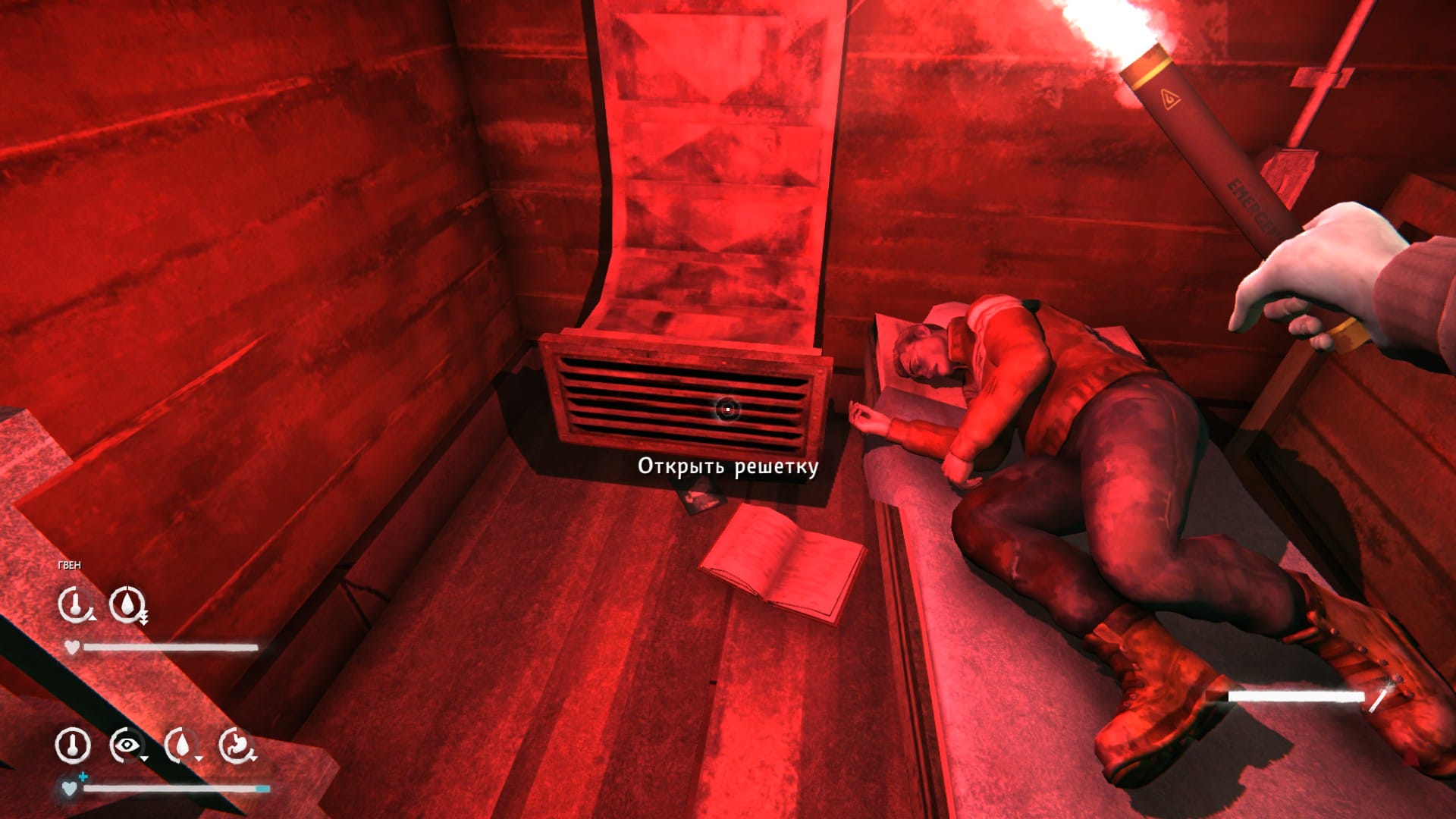 Здесь, помимо еды и рыбацкого свитера, вы найдете записку с координатами следующего бункера — она спрятана в вентиляции, откройте решетку. Именно так игра направляет нас по цепочке тайников. Не обращайте внимание на человека — это Глен, которую по сюжету необходимо перенести с места крушения на Перепутье Томпсона.