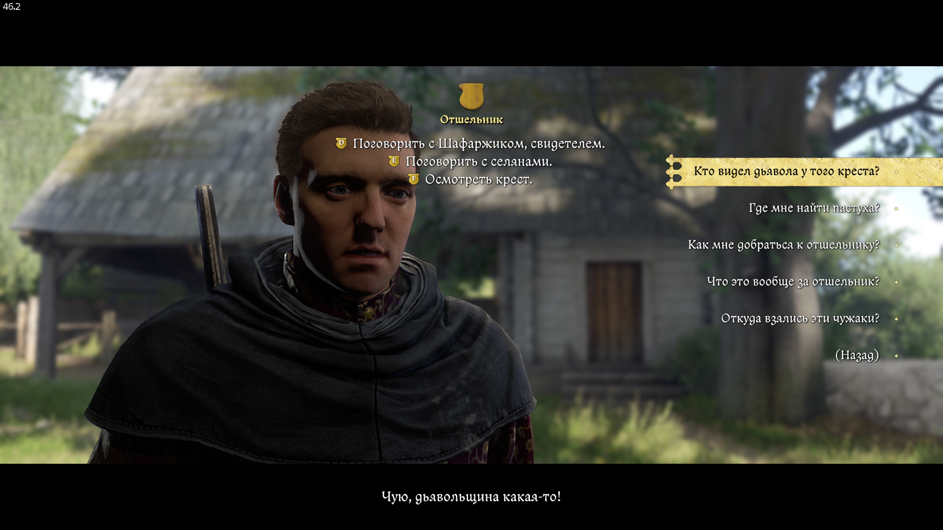 Убедив его рассказать, начинаем задавать наводящие вопросы о дьяволе и отшельнике. Собрав необходимую информацию, можем идти искать дом отшельника.