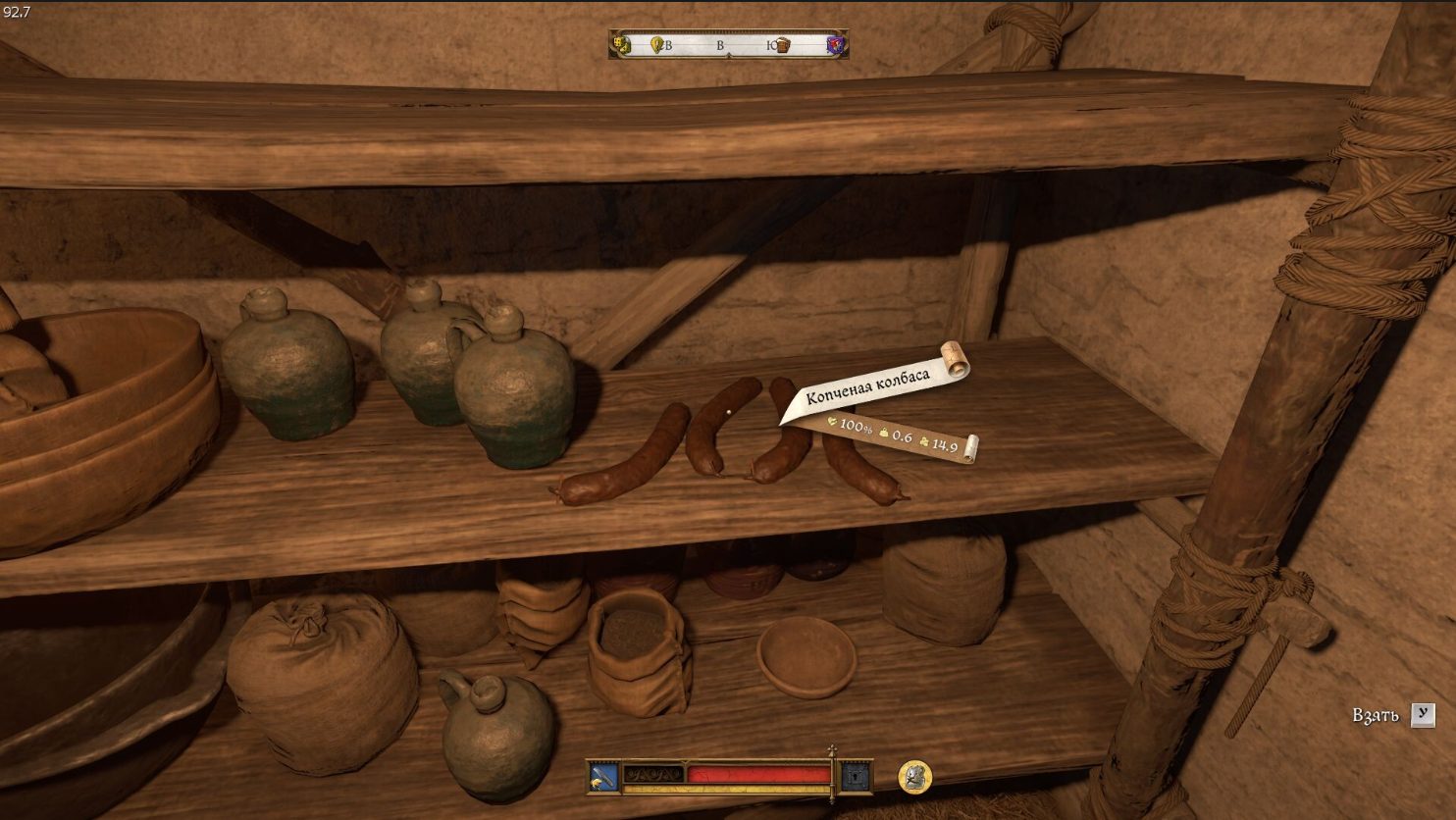 Она разрешает отдать еду и подсказывает, где взять припасы. Идём в кладовку — ту самую, где ранее перетаскивали мешки. На полке стеллажа забираем две палки колбасы. Хлеб лежит рядом, на другом стеллаже.