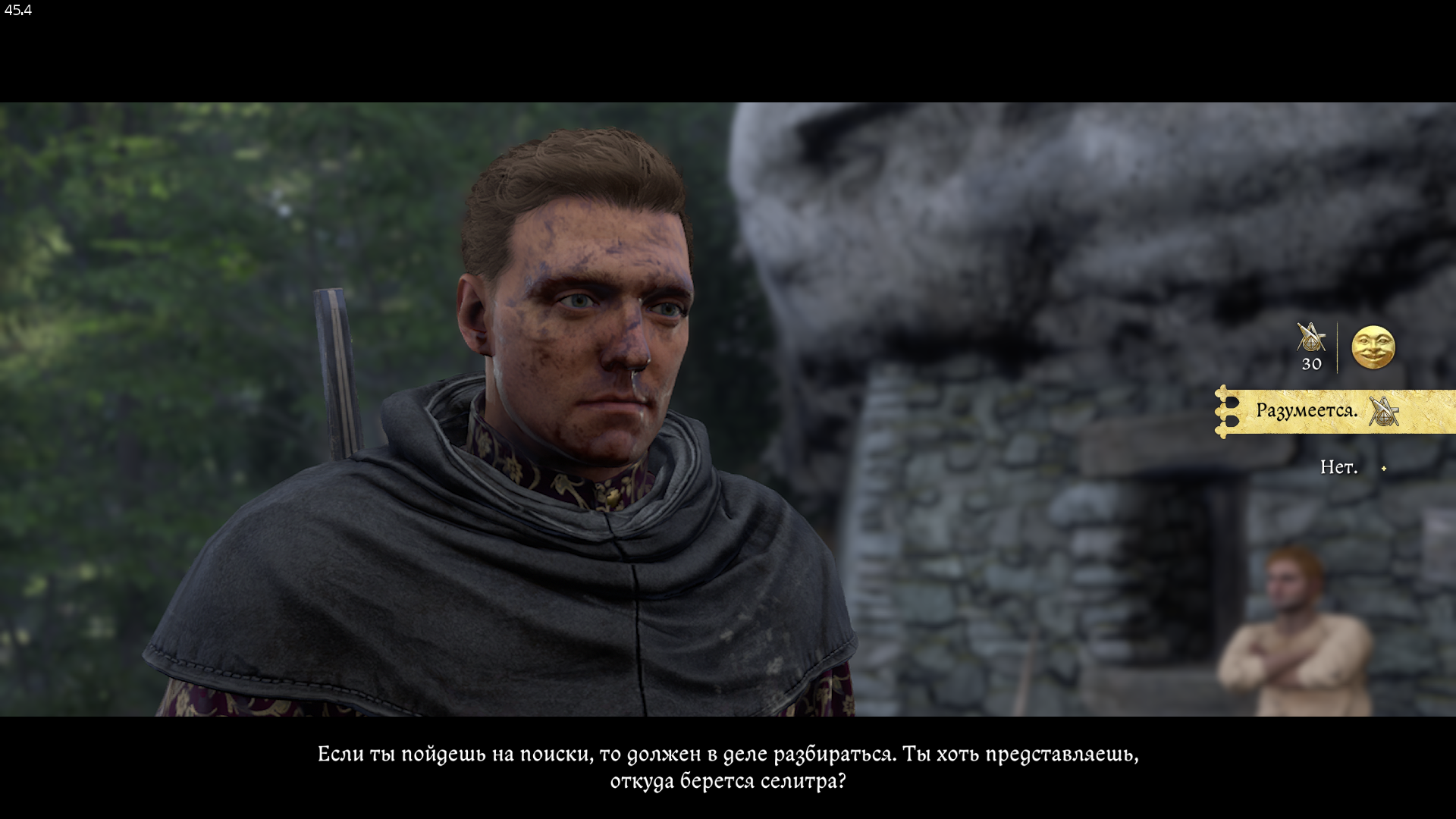 Позже рассказываем, что мы думаем о мельнике Крейзеле. Выбираем любой ответ. Под конец Бонка поинтересуется нашими знаниями о добыче селитры. На этом моменте можете пройти проверку навыка при высокой прокачке. Если не уверены, что пройдете, то просто отвечаем — «Нет».