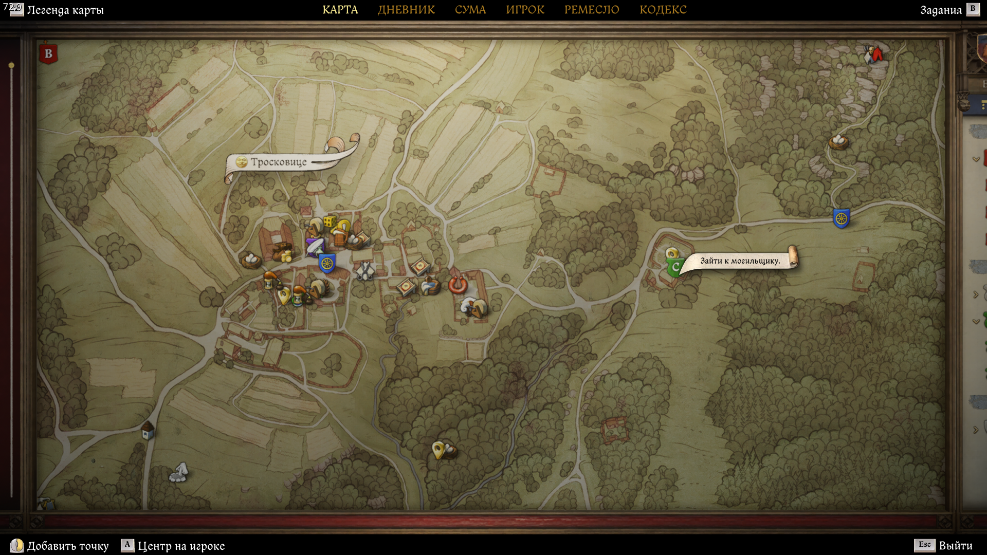 Перемещаемся в Тросковице и сначала заглядываем в мясную лавку, где покупаем сырую свинину. Это необходимо для того, чтобы расположить к себе могильщика Игнаца. После отправляемся к нему на кладбище.