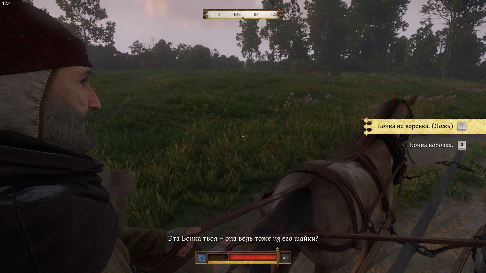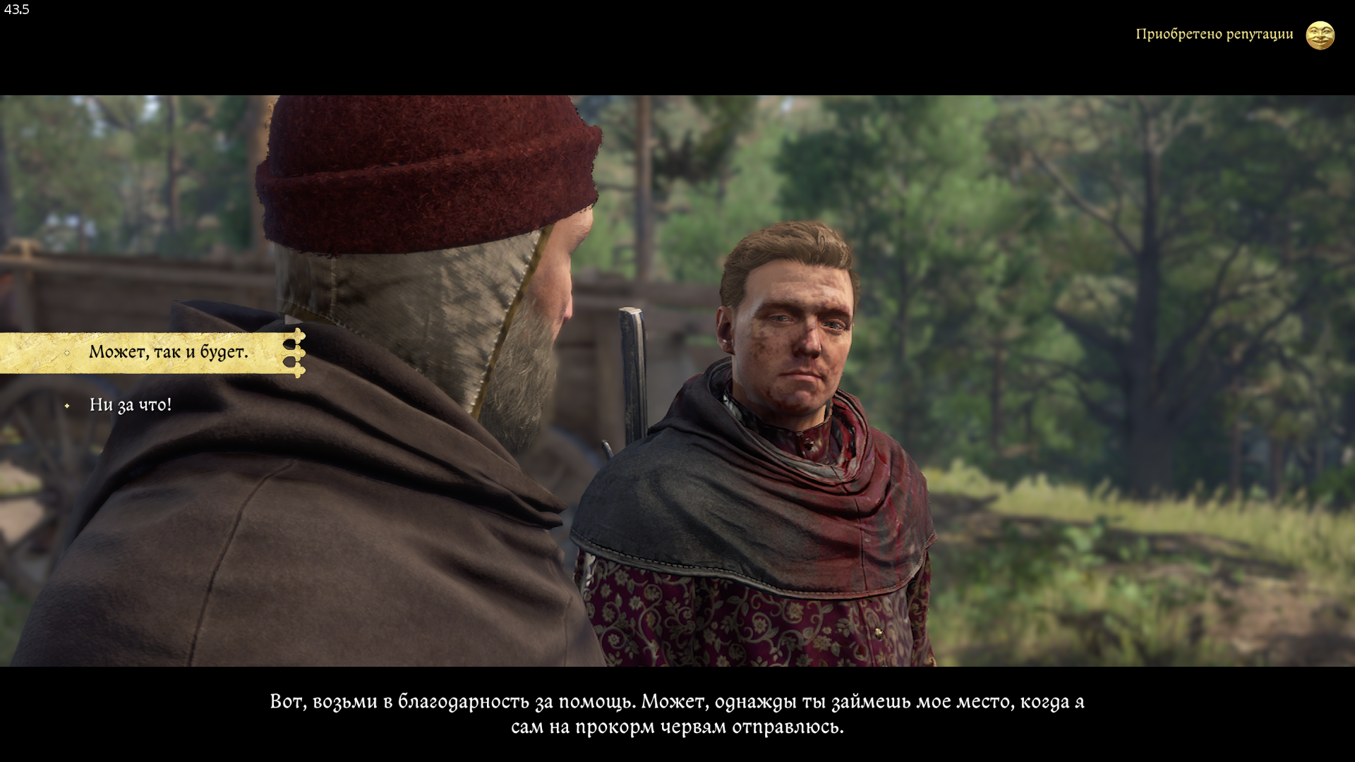 В дороге снова беседуем с ним. Чтобы повысить репутацию, отвечаем — «Можно и так сказать».