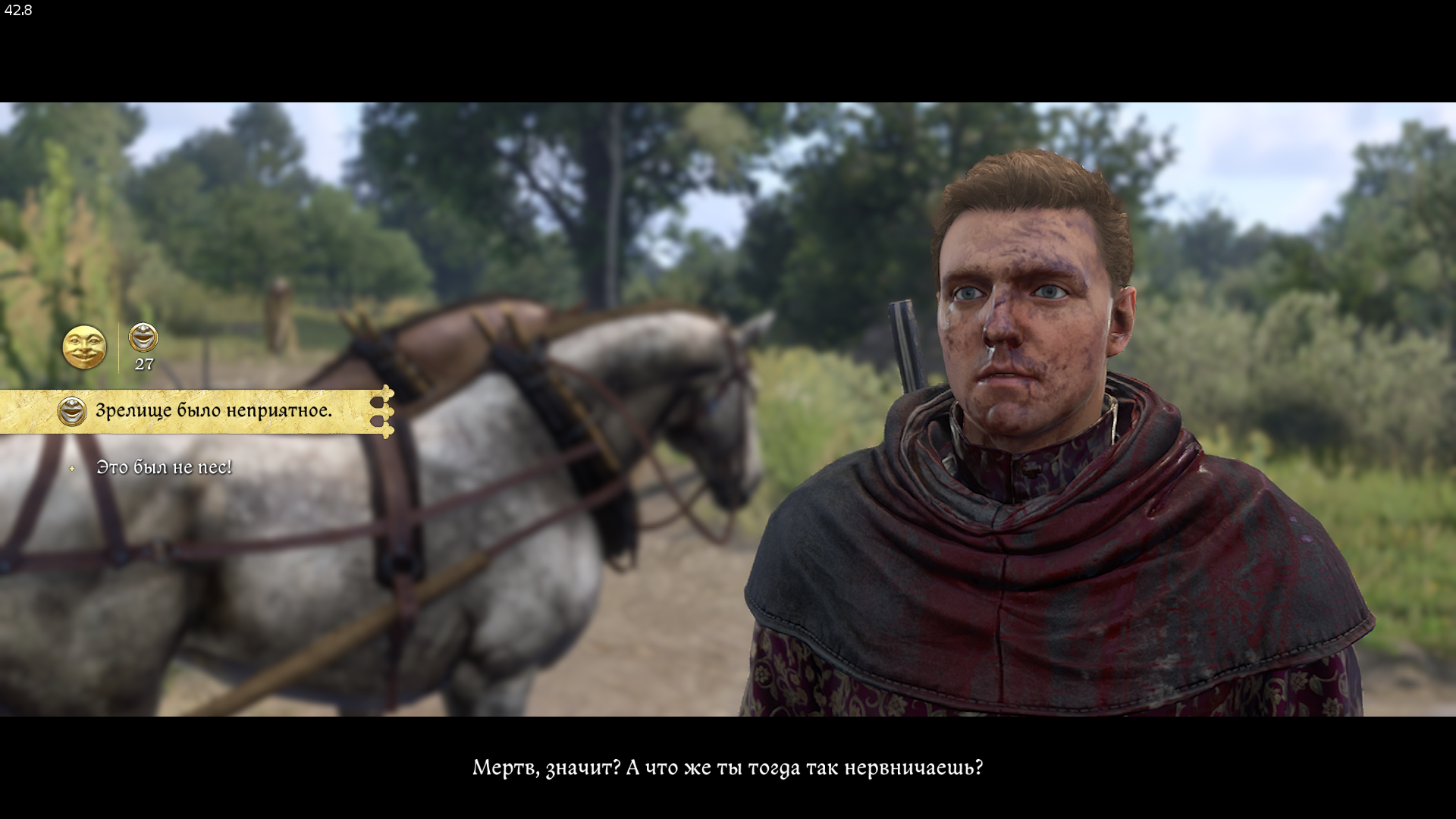 Далее предстоит пройти проверку навыка. Отвечаем — «Зрелище было неприятное». Вторая реплика сразу будет вычислена могильщиком и он раскусит обман.