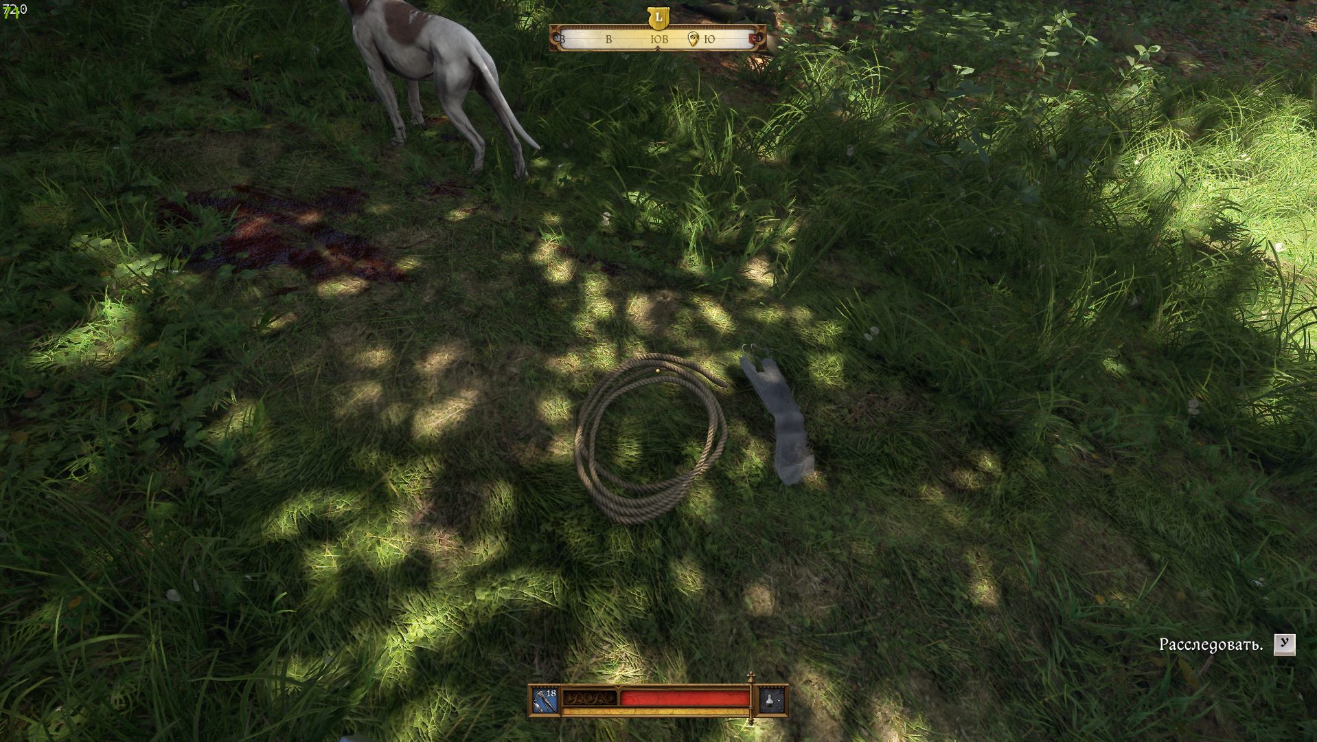 Рядом валяется веревка и заметен еще один след крови. Если до этого вы выполнили квест «Барбос», то сейчас можете дать собаке понюхать обрывок ткани и взять след.