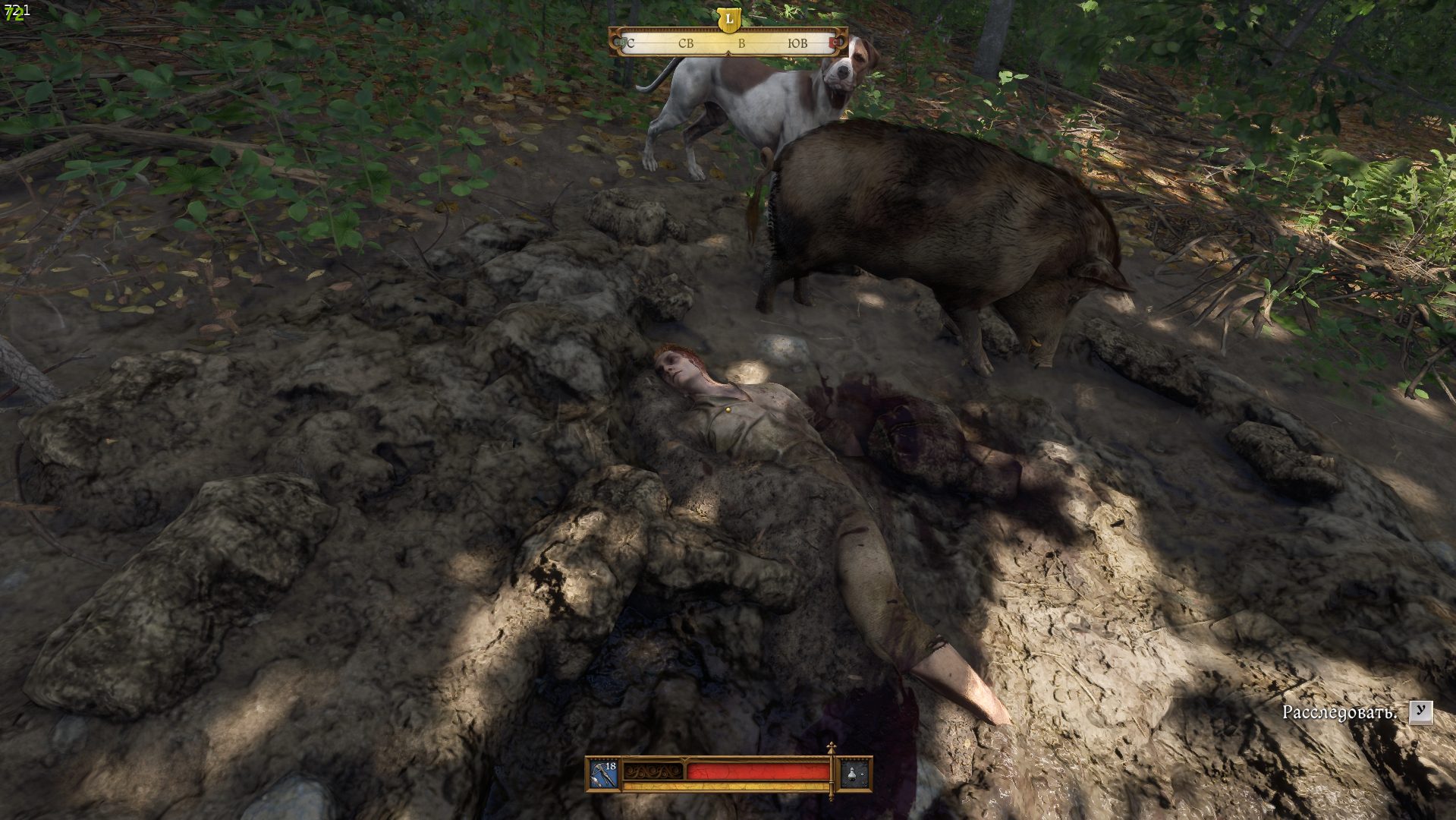 Идем по следу. Вскоре он приведет нас к трупу — это Роман. Рядом трется свинья, она уже успела немного обглодать труп. Не помешает обратиться к свинопасу, возможно он что-то видел.