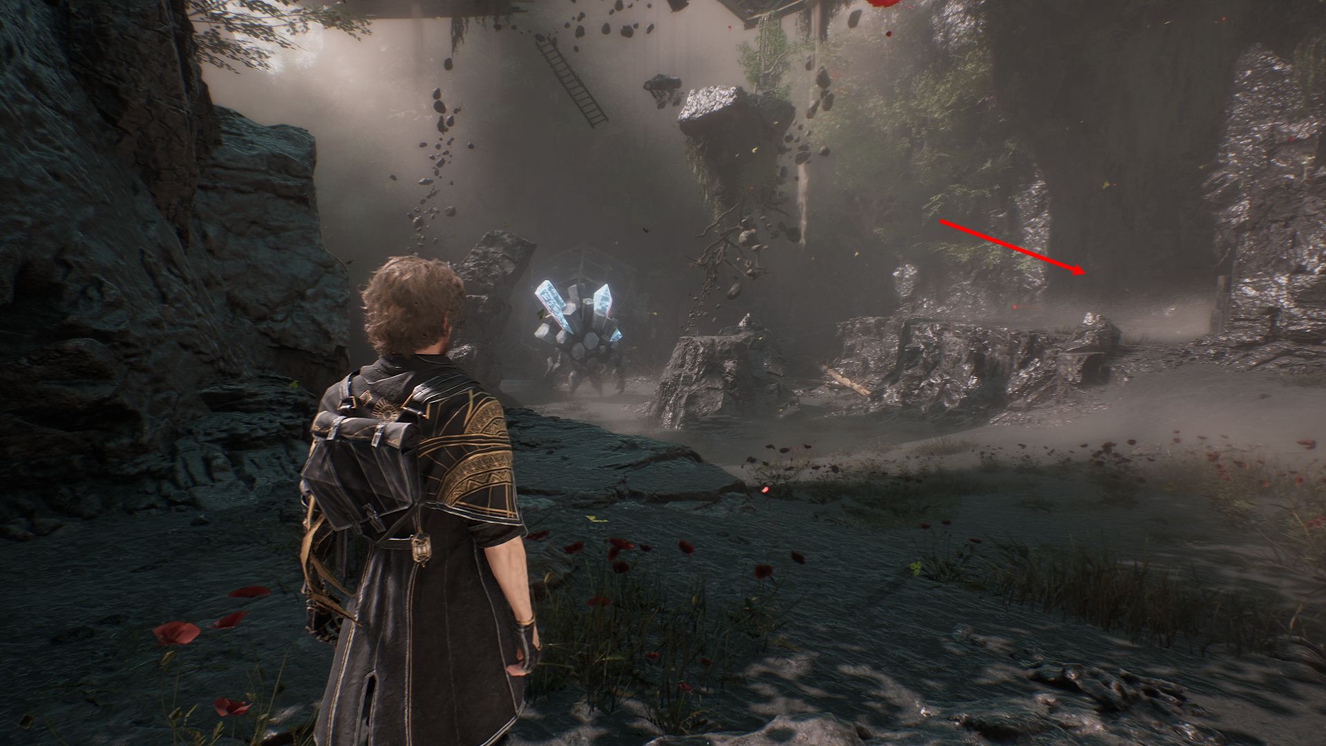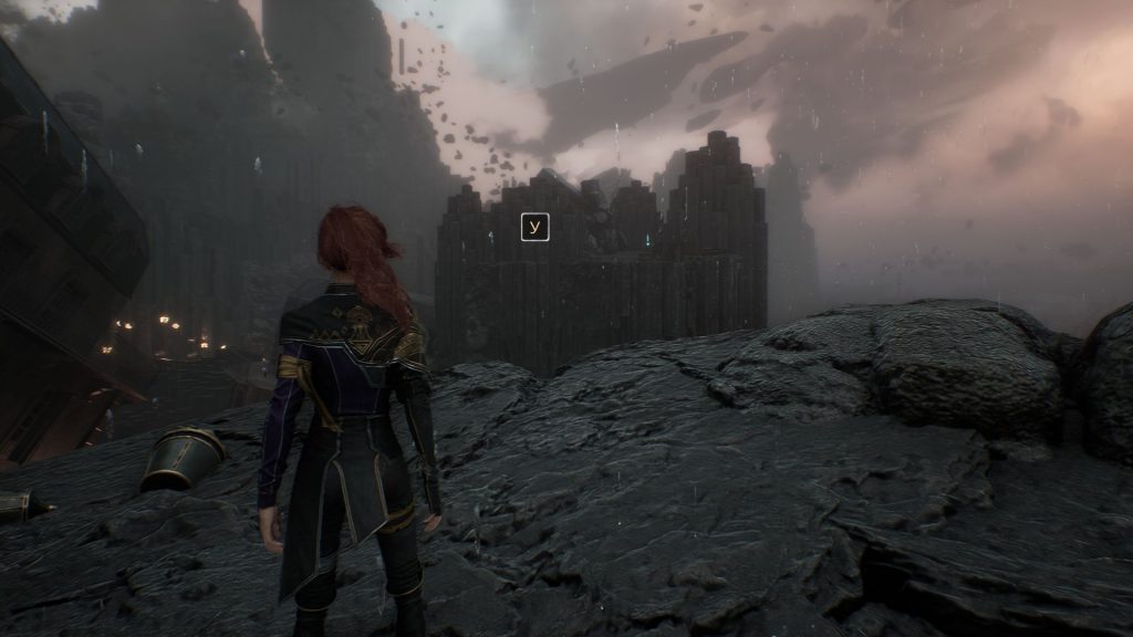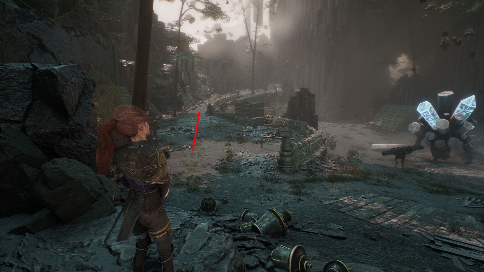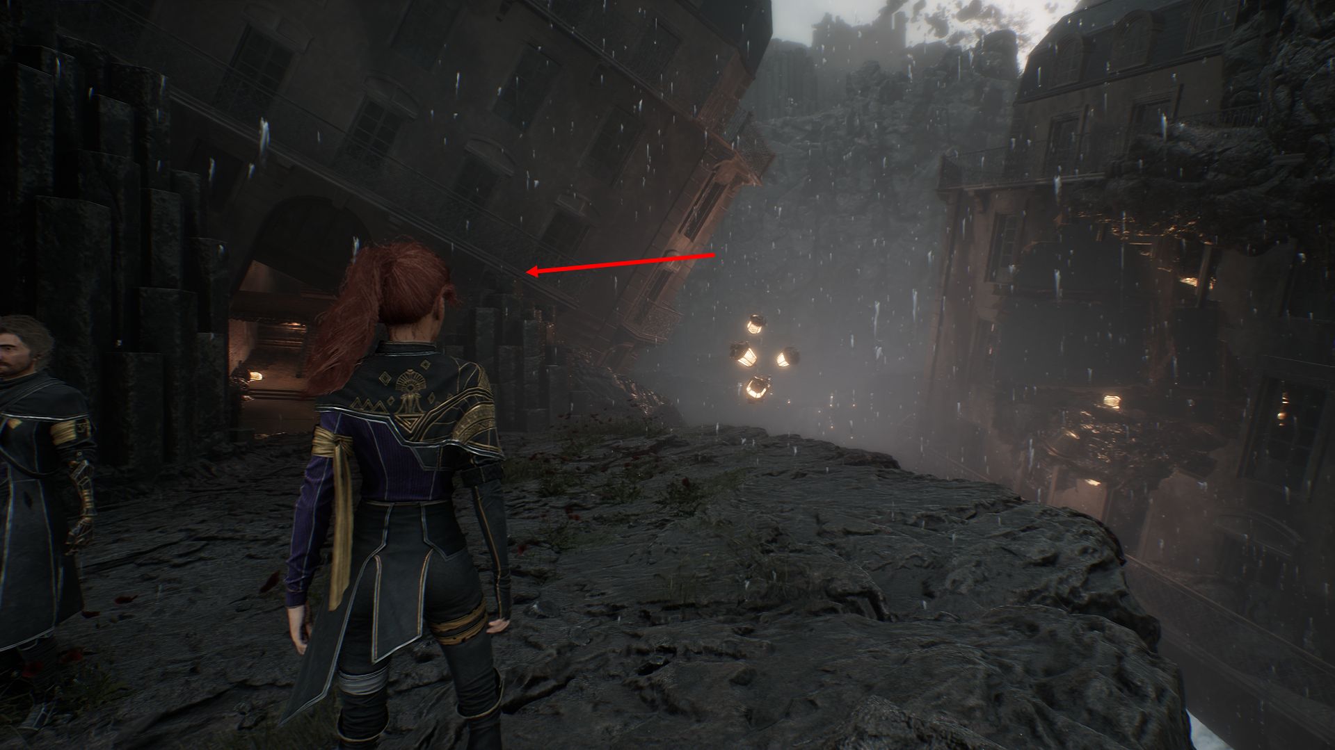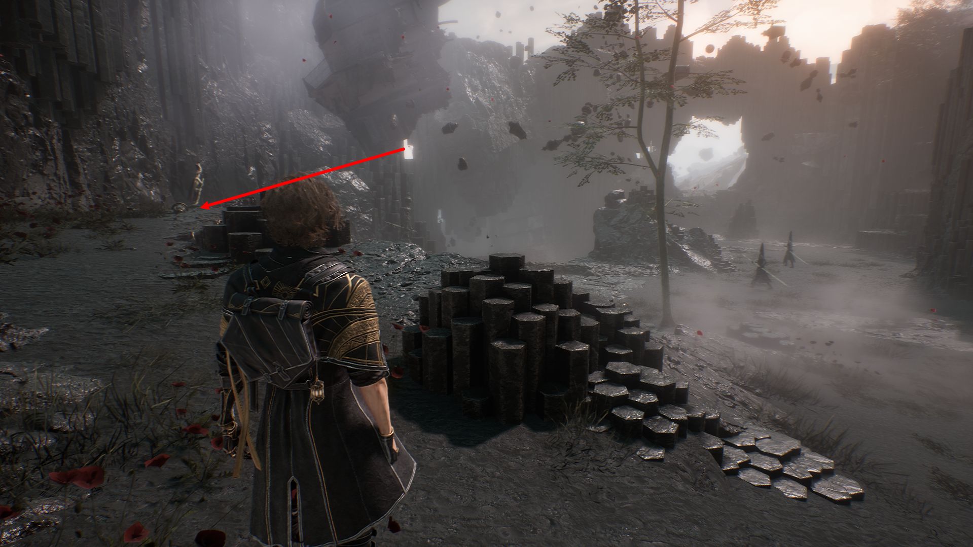 Дойдя до флага, спускаемся вниз и выходим на площадку. На пути никаких секретов в Утесах каменной волны в Expedition 33 нет, поэтому спокойно пробегаем вперед, убиваем троих противников и добираемся до первой развилки. Перед нами будет два разрушенных дома. Сначала идем налево.