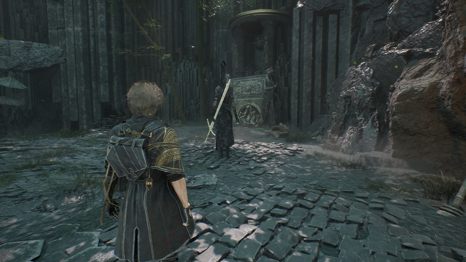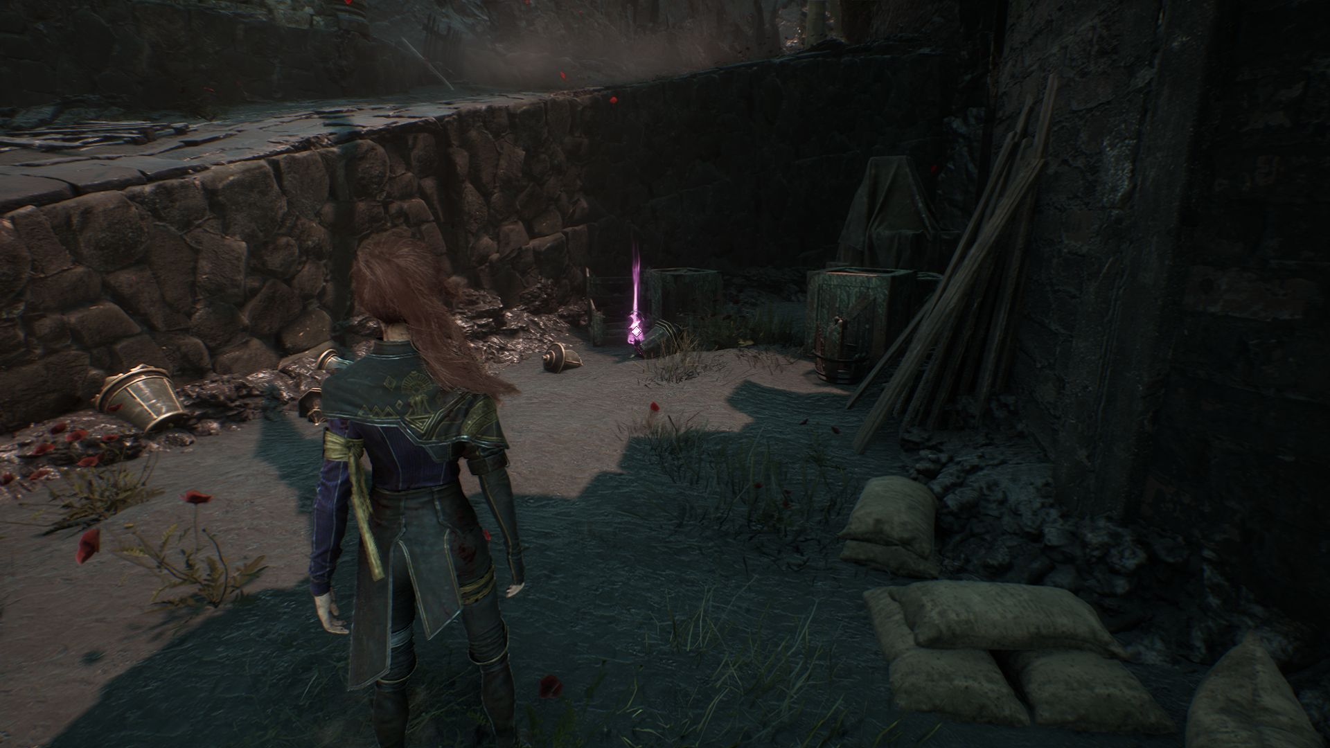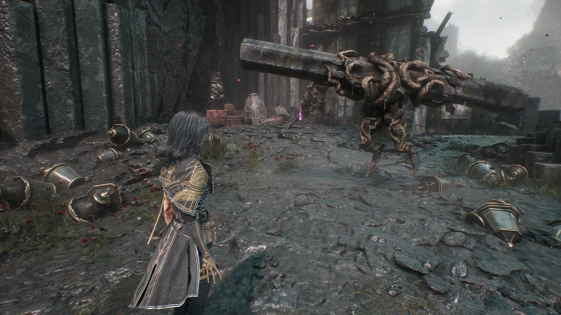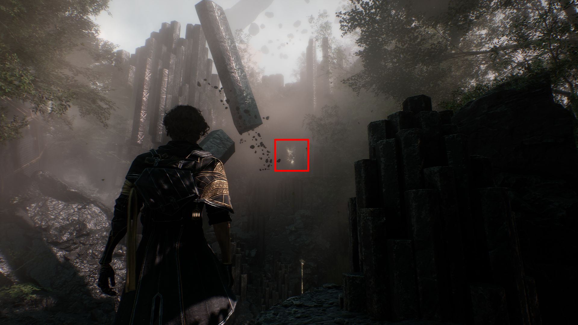 Дойдя до флага, спускаемся вниз и выходим на площадку. На пути никаких секретов в Утесах каменной волны в Expedition 33 нет, поэтому спокойно пробегаем вперед, убиваем троих противников и добираемся до первой развилки. Перед нами будет два разрушенных дома. Сначала идем налево.