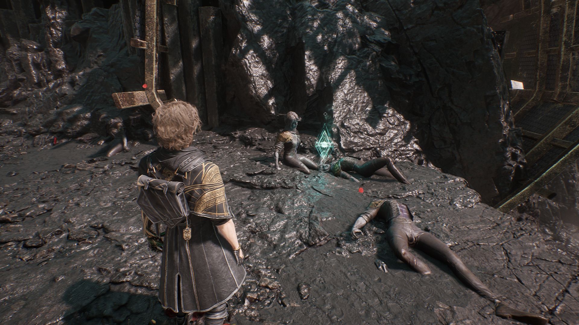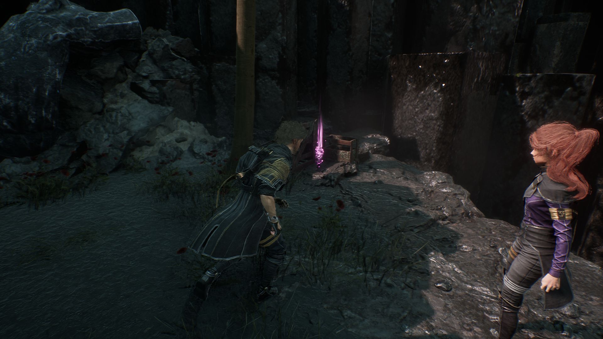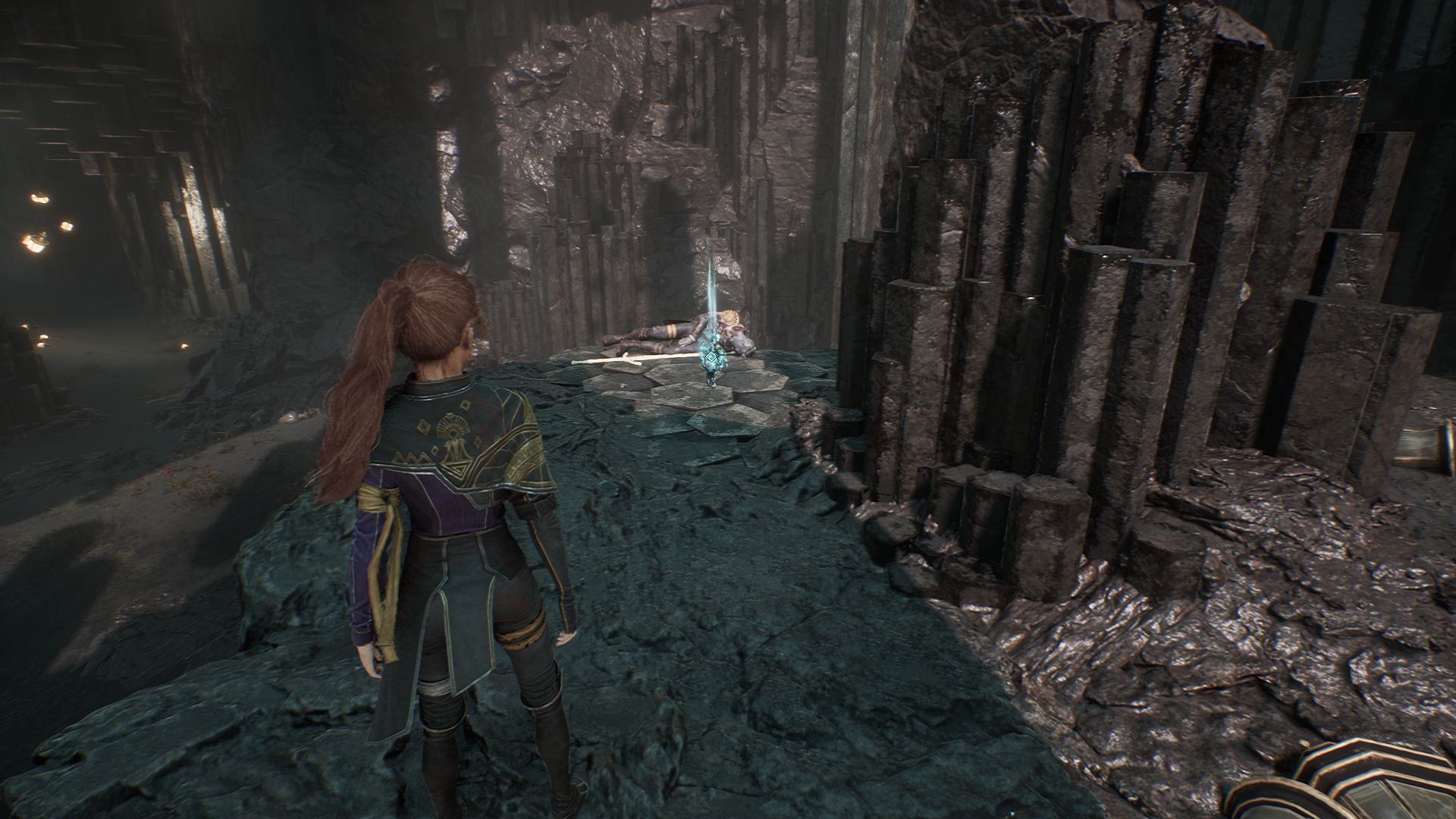 Спуститесь в пещеру и двигайтесь вперед, пока не доберетесь до веревки, ведущей вниз. После спуска увидите первый скальный кристалл слева от себя. Разберитесь с противником рядом и