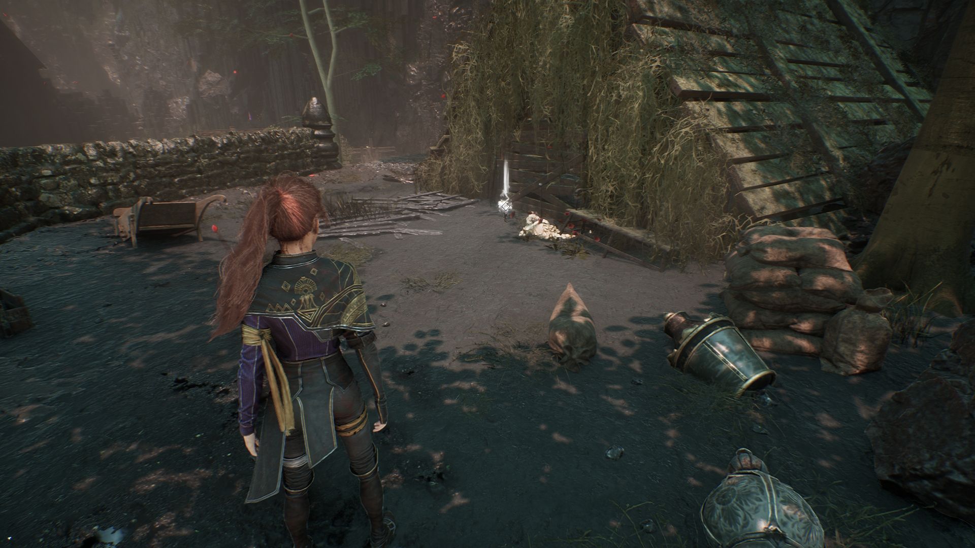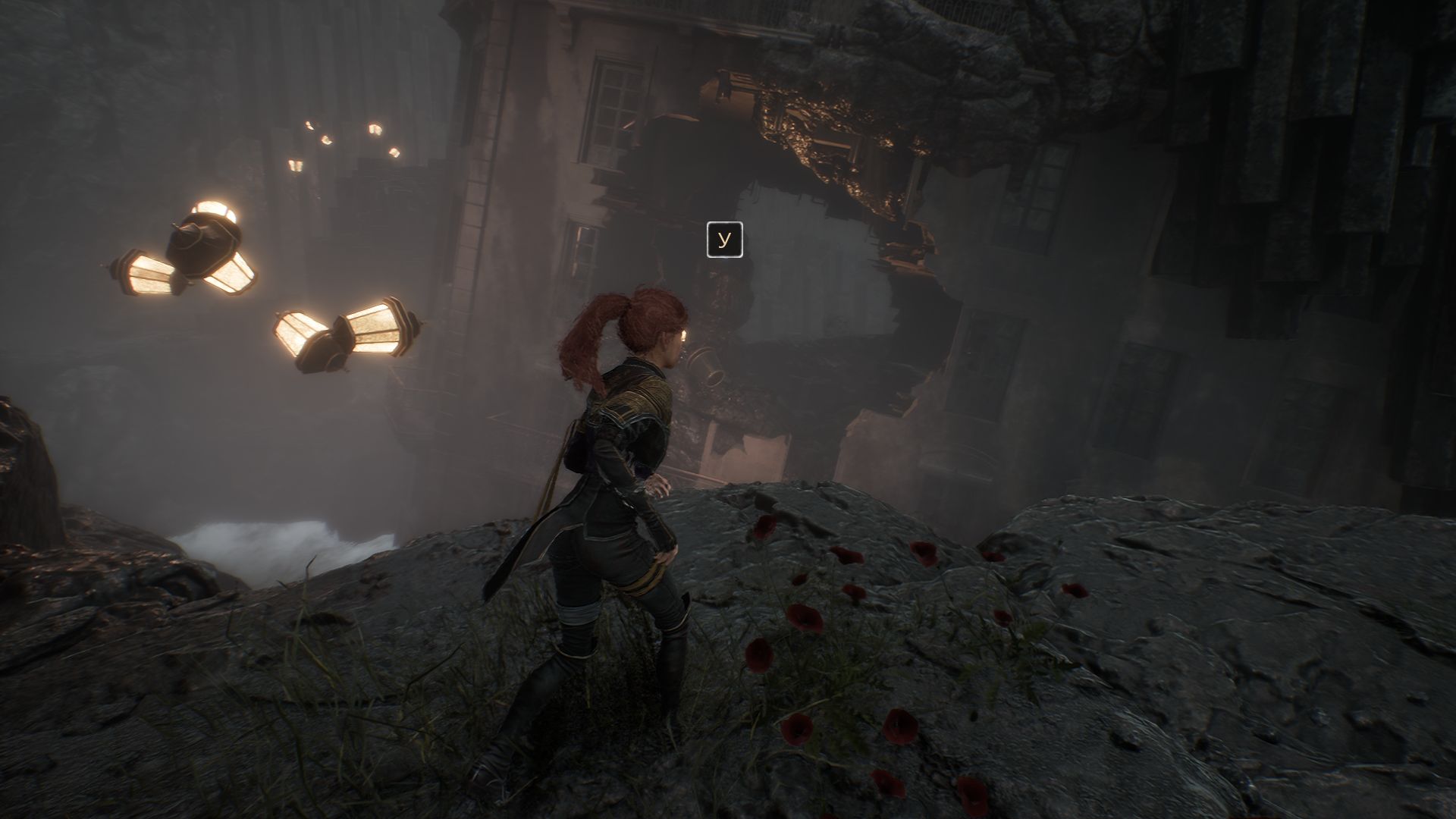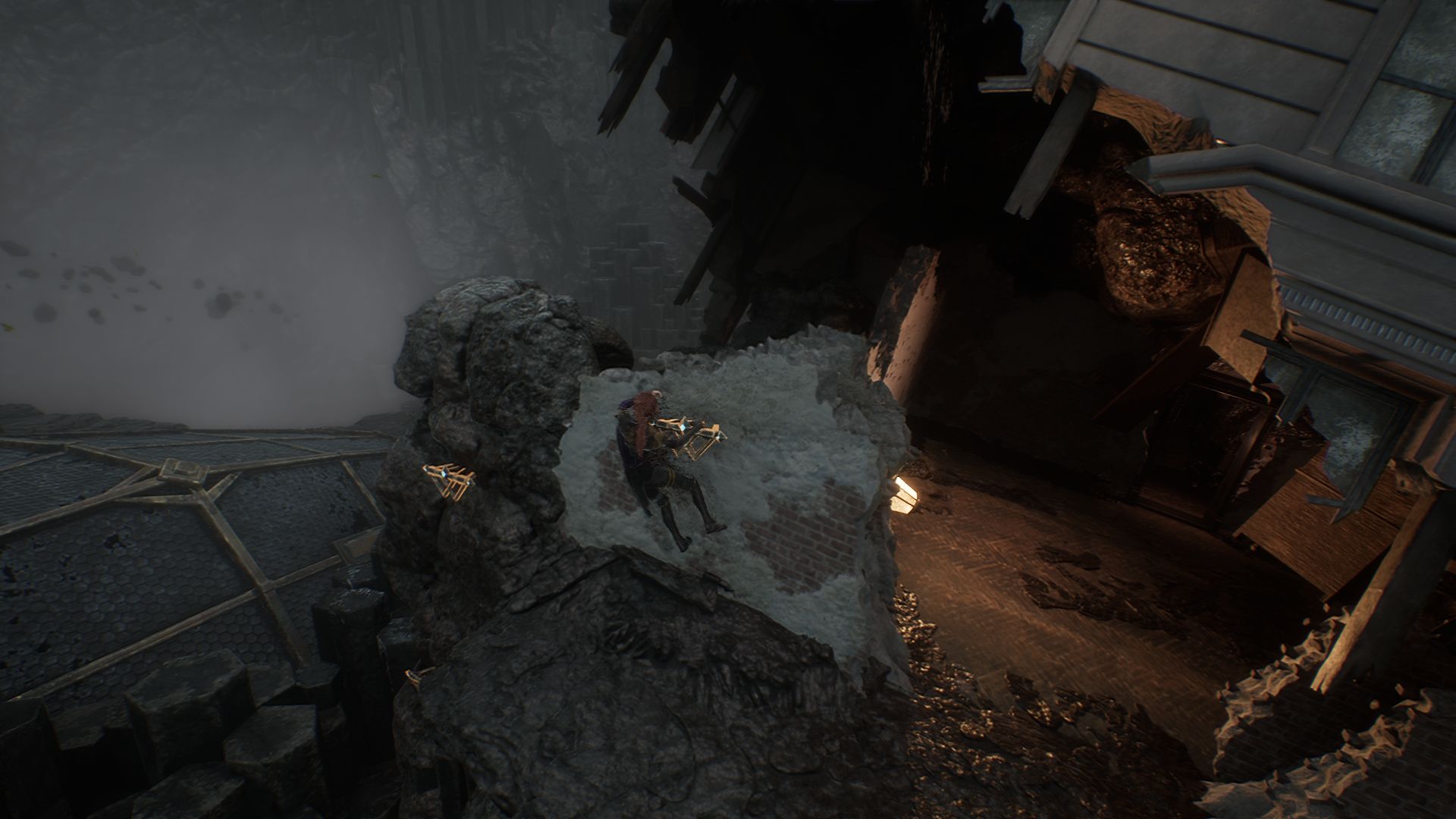 На этот раз проходим вперед и с помощью крюка минуем пропасть. Как только окажемся на другой стороне, обратите внимание на разрушенный дом слева. Убейте культиста с щитами и подойдите к постройке.
