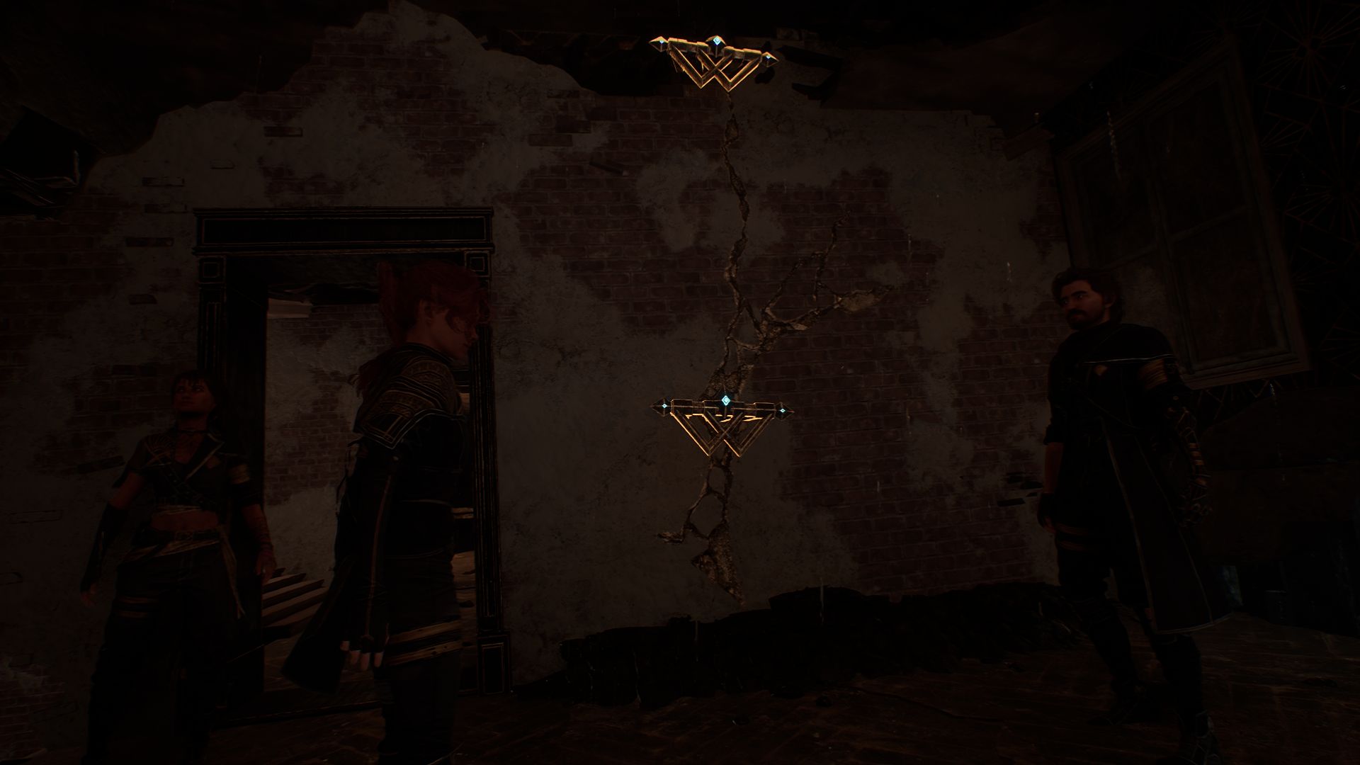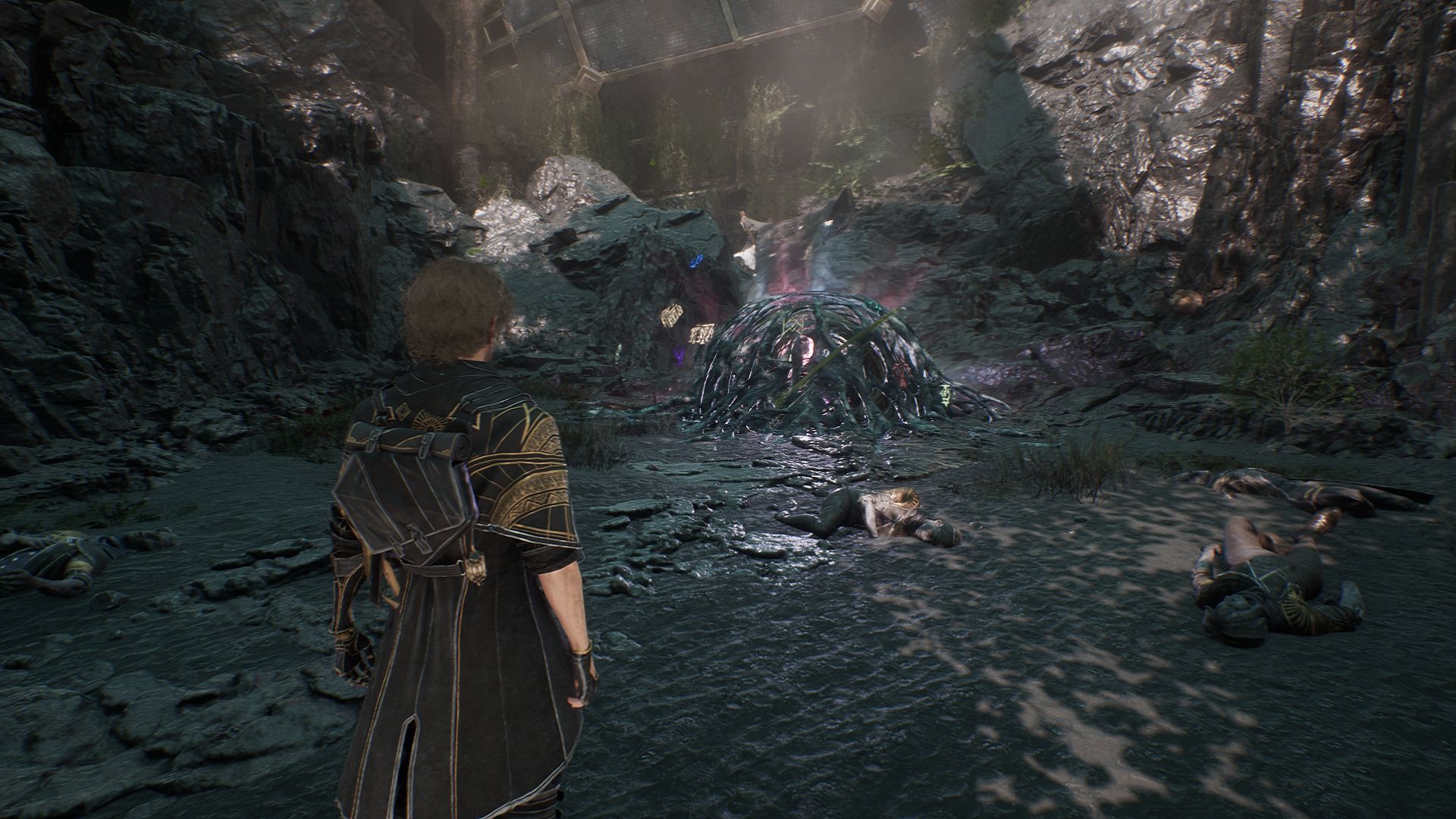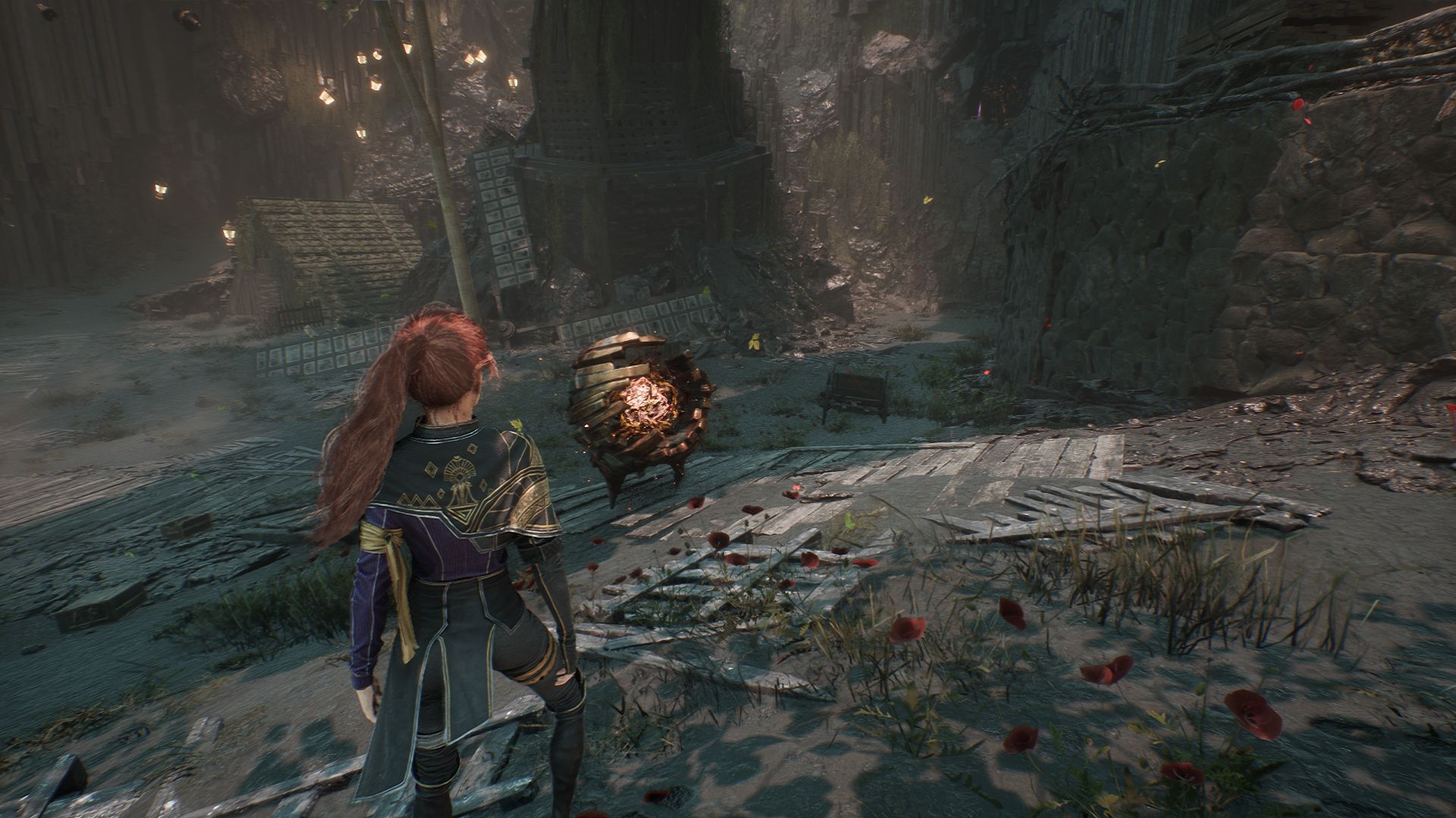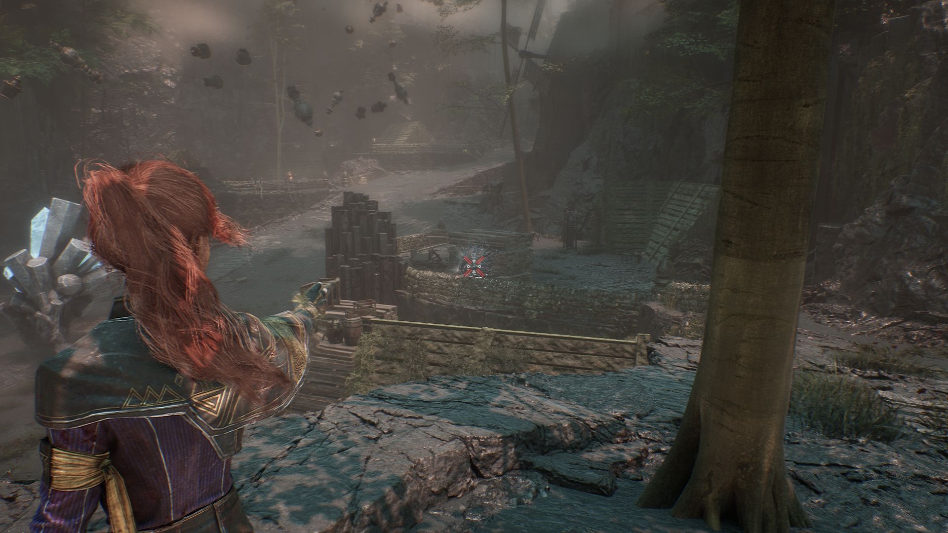 На этот раз проходим вперед и с помощью крюка минуем пропасть. Как только окажемся на другой стороне, обратите внимание на разрушенный дом слева. Убейте культиста с щитами и подойдите к постройке.