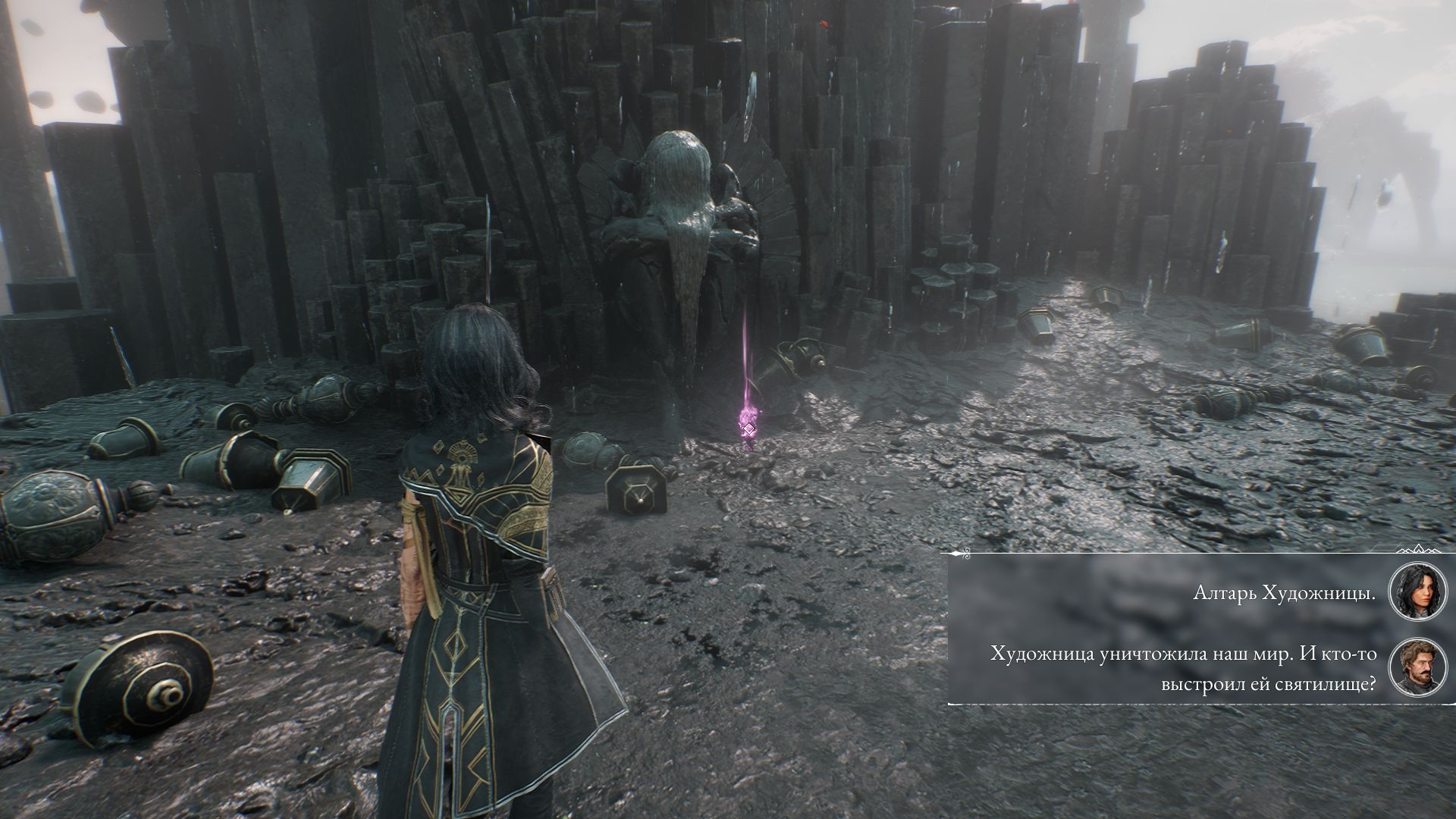 Вернувшись к флагу, идем дальше по мосту. Возле корабля обнаружим алтарь Художницы — пропустить невозможно, герои обязательно отметят это место. Заберите цвет люмины.