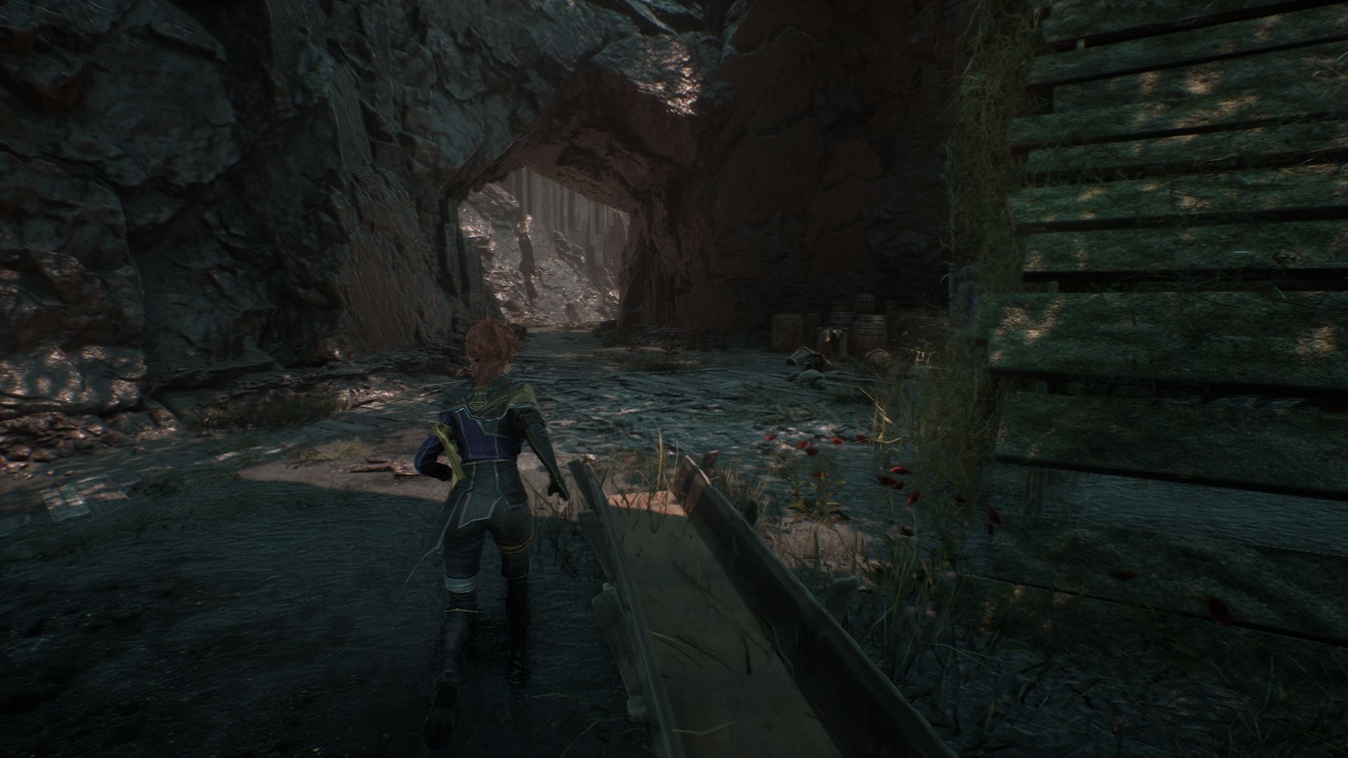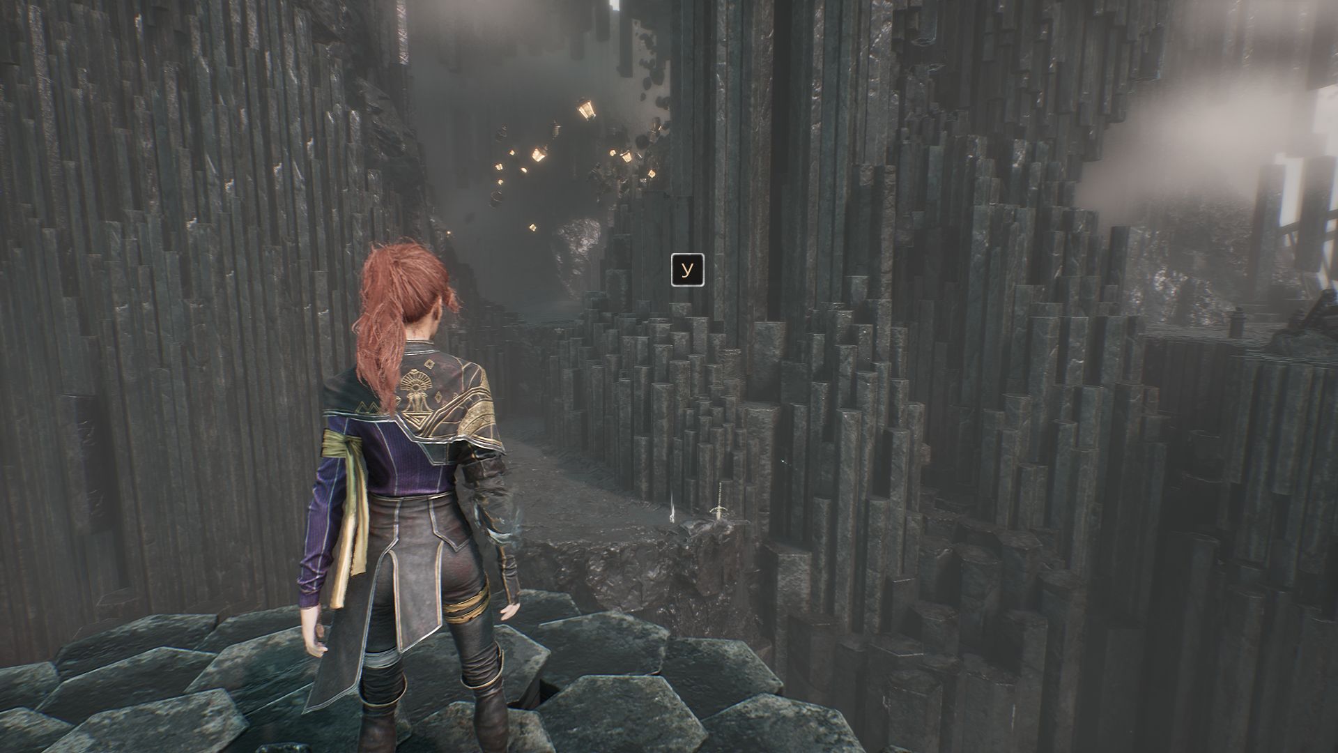 Бежим далее по тропе через следующую пещеру и выйдем к пропасти, которую можно миновать с помощью опор на скале.