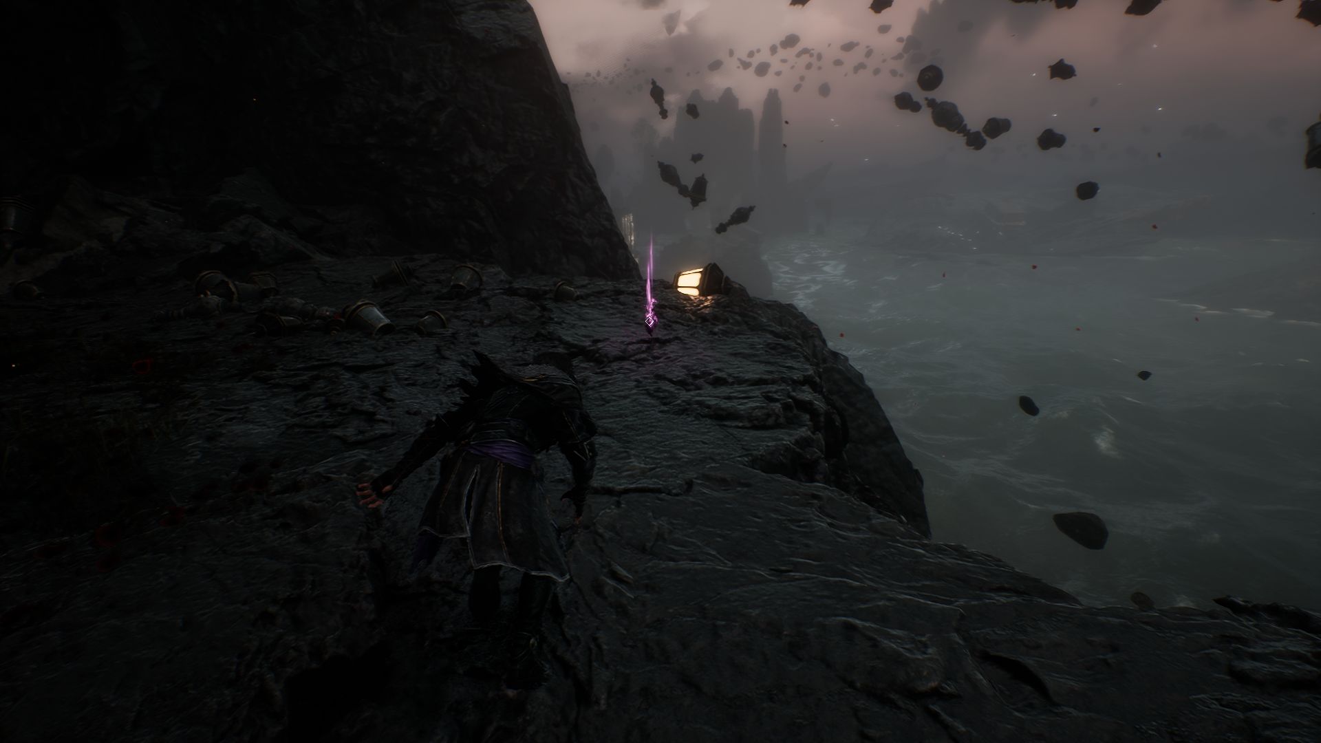 Возвращаемся назад и проходим далее — с помощью крюка минуем пропасть. На пути встретим призрачного мальчика, справа от него у обрыва найдете 790 хромы.